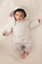 Combinaison en maille de coton doux. Modèle avec capuche à oreilles appliquées et boutonnage devant. Poches plaquées à bord côtelé devant. Finition côtelée autour de la capuche, aux poignets et en bas de jambe.