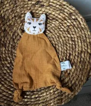 PERSONNALISABLE avec le prénom de bébé ou avec un petit mot d'amour de votre choix.Offrez à bébé un compagnon doux et réconfortant avec ce doudou Chat en double gaze camel Carotte & cie.