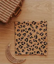 Double gaze de coton camel à motifs léopard noir et violet certifiée sans substance nocive ou irritante.