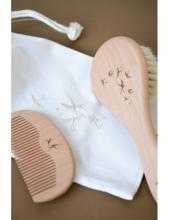 Craquez pour ce joli set de brosse et peigne pour bébé en bois de hêtre avec sa gravure hirondelle et son élégant pochon de rangement brodé. Un joli cadeau de naissance à (s') offrir !