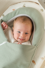 Idéal pour les premières semaines de vie du nouveau-né : facilite en douceur la transition in utero -rel: ex utero Espace délimité qui rassure le nouveau-né et favorise l’apaisement Soutien de la posture fléchie idéale pour le développement du bébé et mains proches du visage pour qu’il puisse s’auto-rassurer Diminue le