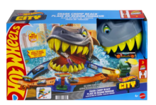 Kinderen en hun Hot Wheels speelgoedauto's nemen het op tegen een hongerige haaienvijand in de Hot Wheels City Haaienstrand speelset. Pas de draaibare lanc