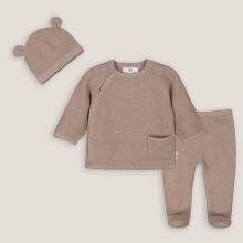 Ensemble 3 pièces en tricot composé d'une brassière, d'un pantalon à pieds et d'un bonnet assorti. Idéal comme cadeau de naissance.