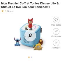 Avec le coffret de démarrage Mon Premier Coffret Toniebox 2 - Bleu Ciel et les deux figurines Disney (Stich et Le Roi Lion), embarquez pour une aventure audio interactive unique ! Grâce à son Tonie Créatif Rubie inclus dans le coffret, ajoutez jusqu'à 90 minutes de contenu audio personnalisé et accédez à plus de 10H de contenus gratuits, à télécharger directement via l'application tonies®. Robuste, intuitive et résistante aux petites chutes du quotidien, la Toniebox va devenir la meilleure amie de votre enfant ! Et ce n’est...
