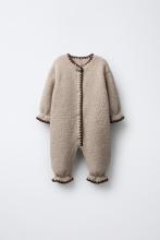 Combinaison effet mouton à col rond et manches longues. Fermeture par boutons-pression dissimulés sur le devant. Finitions en gomme élastique avec liserés couleur à contraste.