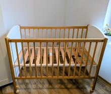 Déjà acheté en seconde main : lit bébé couleurs chêne et blanc, très solide, parfait pour accueillir bébé jusque ses 2 ans au moins !