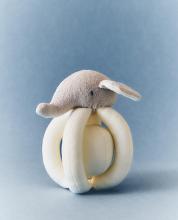 Hochet en peluche pour enfant avec tête d’éléphant et anses pour l’attraper.