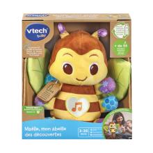 Bébé fait le plein de découvertes avec la peluche musicale : Maëlle, mon abeille des découvertes.
