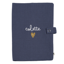 Carnet de santé de bébé avec nos protèges carnet bleu jean personnalisables en gaze de coton OEKO-TEX.