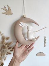 ♥ Cette jolie décoration est entièrement faite à la main en coton, et représente un petit lapin sur sa lune, à personnaliser avec le prénom ou le mot de votre choix sur sa canne à pêche!Cet objet sera parfait pour décorer une chambre d'enfant ou bébé, permettant d'apporter de la douceur et de la poésie dans leur joli