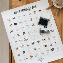 Le cadeau naissance qu'on garde toute la vie - Affiche pour bébé illustrée, accompagnée d'un tampon dateur pour conserver un cadeau personnalisé de toutes les premières fois des bébés.