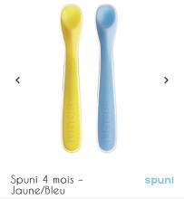 Cuillères Spuni bébé (lot de 2) : ergonomiques et brevetées, elles facilitent la transition sein/biberon-cuillère dès 4 mois et respectent les capacités oro-motrices.