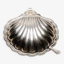 Shell butter dish and knife in silver-plated metal dating from the 1970s. Composed of a silver-plated bowl and a matching lid. It features a removable frosted glass insert. The metal shows slight patina; overall good condition.