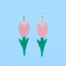 Boucles d'oreilles Coucou Suzette à crochet doré ornées de jolies tulipes rose et verte rétro en acétate. Ultra légère et confortable.