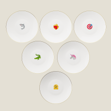 Coffret de 6 assiettes à entrée de 21.5 cm de diamètre en porcelaine blanche avec liseré or et sérigraphie emoji.