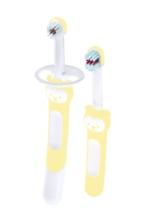 Learn to Brush Set se compose d'une brosse d'apprentissage MAM Training Brush et d'une première brosse à dents MAM Baby Brush.