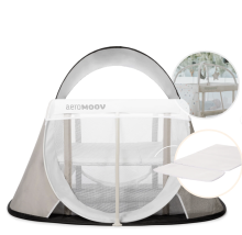 Toutes les fonctionnalités réunies : Lit de voyage Instant ✚ arche de jouets ✚ pare-soleil ✚ moustiquaire ✚ protège-matelas 3D ✚ drap-housse