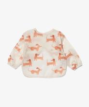 Lorsque les bébés veulent commencer à manger seuls, un bavoir à manches est idéal car il couvre ses vêtements. Ce bavoir convient aux bébés de 9 à 18 mois environ. Il est imperméable et facile à nettoyer. Le dos du bavoir beige orné de chiens joyeux est muni d’une fermeture auto-agrippante.