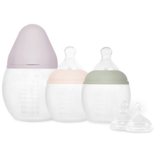 Coffret de naissance Élhée, composé de 3 biberons anti-colique en silicone médical + un set de tétines débit XS. Coloris au Choix - Fabriqué en France.