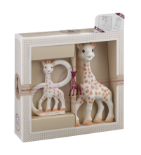 Ce coffret comprend : Sophie la girafe, le premier jouet de Bébé qui met tous ses sens en éveil, un anneau de dentition en caoutchouc 100% naturel, un sac cadeau et une carte personnalisable.