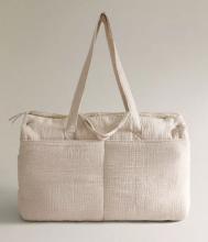 Sac à langer uni en gaze de coton à imprimé en forme de lunes et d’étoiles à l’intérieur. Il se ferme à l’aide d’une fermeture Éclair.Il est doté de six poches extérieures, deux types de poignées (courtes et longues), de compartiments à l’intérieur et d’un système de fermeture type clip pour ranger des objets à l’intérieur du sac.