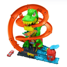 Avec des compétences de course épiques, Hot Wheels City peut être protégée d'un T-Rex dynamique qui veut dévorer toutes les voitures. Les enfants lancent le camion de pompiers moulé sous pression à l'échelle 1:64 inclus et il fonce autour du dinosaure, avec trois issues possibles : soit il est mangé et ressort par l'arrière, soit il prend un détour pour faire le plein, soit il vainc le monstre et sauve ses amis. Chaque fois qu'une voiture passe, les yeux du T-Rex tournent et ses bras tremblent jusqu'à ce qu'il s'effondre.
