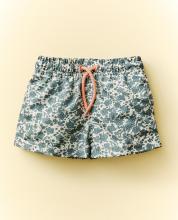 Maillot de bain de plage pour enfant type bermuda à taille élastique, cordons de serrage sur le devant et motifs à imprimé fleurs tropicales.