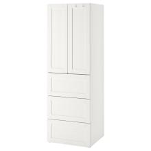 Exemple. SMÅSTAD / PLATSA armoire-penderie, blanc avec cadre/avec 3 tiroirs, 60x57x181 cm Cette armoire est assez grande pour pouvoir y ranger tous les vêtements de votre enfant, de ses plus jeunes années à son adolescence. Elle est équipée de crochets sur lesquels votre enfant peut suspendre et attraper seul ses affaires.