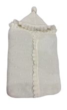 Le set est acheté en seconde main et comprend : une chancelière blanche en maille avec capuche (photo) et une chancelière blanche en coton avec des coutures beiges.