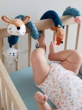 Enroulez cette belle spirale d'activités autour d'un lit, d'une poussette ou d'un cosy ! Elle amusera bébé avec ses petits jouets intrigants. Lapin et anneau, renard vibrant... C'est parti pour de joyeuses découvert