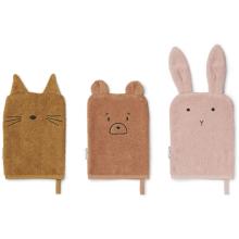 A la fois marionnettes et gants de toilettes, ces gants sont fabriqués en coton bio. Ce lot comprends 3 modèles différents. 15 x 21 cm.