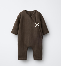Combinaison matelassée avec col en V et manches longues. Fermeture croisée sur le devant avec bouton-pression invisible et décor noeud de couleur contrastée.