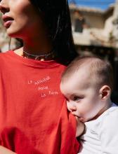 T-shirt d'allaitement · Ouvertures zips pour allaiter discrètement · Coloris rouge broderie Le meilleur pour la faim · Col rond · Manches courtes · Coupe oversize.