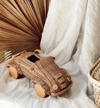 Cette petite voiture en rotin sera parfaite pour mes après-midi de jeux.
