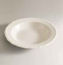 Assiette creuse en faïence de couleur écrue. Modèle uni orné d’un relief décoratif sur le bord.