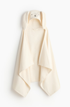 Drap de bain en coton éponge doux. Modèle avec oreilles appliquées sur la capuche et bride de suspension dans la nuque.