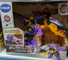 Dinosaure qui se transforme en voiture de course.