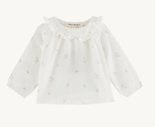Blouse écrue à motif fleuri en gaze de coton, col volanté et ouverture pressionnée au niveau de l'épaule. Taille 3 mois.