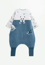 Cette turbulette bleue en velours a son petit patch panda plein de tendresse et ses détails pratiques : manches amovibles et pieds retroussables.