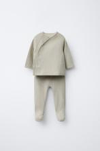 Ensemble deux pièces. T-shirt avec col en V et manches longues. Fermeture croisée sur le devant par boutons-pression. Legging avec taille élastique.