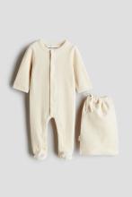 H&M Adorables. Coffret-cadeau comprenant un pyjama et une adorable pochette de rangement, tous deux réalisés en velours de coton de haute qualité très doux. Pyjama à manches longues avec encolure ronde et fermeture pressionnée devant. Boutons-pression dissimulés à l'entrejambe, d'une cheville à l'autre, pour faciliter le change. Pieds fermés. Pochette refermable par cordon de serrage. Dimensions de la pochette : Largeur 20 cm. Hauteur 28 cm. La collection H&M Adorables regroupe une sélection d'articles de qualité très confortables au charme intemporel.