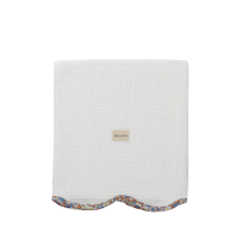 Triple mousseline de gaze en 100% coton biologique en blanc avec tissu Liberty. Les mousselines sont indispensables pour les couches de bébé. Elles sont polyvalentes et très pratiques grâce à leur respirabilité et à leur grand pouvoir d'absorption.
