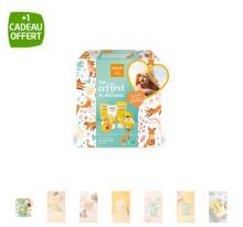 Mon coffret de naissance Weleda avec une Crème lavante Corps et Cheveux, une Crème protectrice Visage, une Crème pour le Change, un Baume intense universel, et une cape de bain en coton bio.