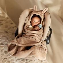 Craquez pour cette couverture portefeuille lapin en velours côtelé et moumoute de Jollein : douce, pratique et craquante avec sa capuche à oreilles !
