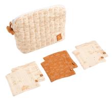 Trousse de toilette en double gaze de coton et carrés éponge - orsino beige - Délicatemement décorée aux couleurs du thème Orsino, cette trousse en double gaze de coton est idéale pour y glisser l'essentiel pour la toilette et les soins d