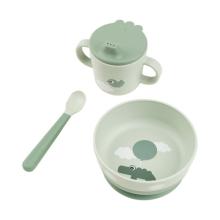Set premier repas en silicone qui contient un bol avec ventouse pour éviter les accidents, un gobelet à poignées avec un bec pour boire en toute autonomie et une cuillère conçue pour les petites mains. Convient au lave-vaisselle et au micro-ondes. Marque : Done by Deer. Modèle : Happy Clouds Green.
