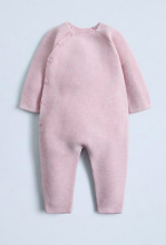 Combinaison en maille à col rond et manches longues. Fermeture par boutonnage devant. Détail fraises brodées.