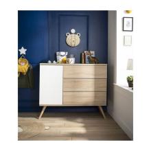 Découvrez notre commode à l'esprit rétro de la collection Seventies. Apportez de la douceur à la chambre de bébé avec son décor chêne doré et blanc laqué.