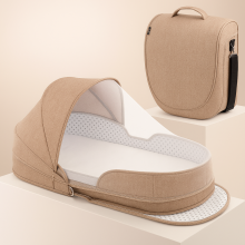 Sac à langer matelas pliable pour bébé, avec moustiquaire et pare-soleil intégrés. Se transforme en lit d’appoint sécurisé avec barrières rigides pour co-dodo. Utilisable dès la naissance, lavable, format sac à dos facile à transporter.
