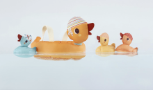 jouet de bain magnétique : ainsi, les trois petits canards peuvent flotter séparément ou ensemble, les uns derrière les autres. Sous chacun d’eux, un chiffre caché est à découvrir : parfait quand on commence à se familiariser avec les chiffres. Maman canard flotte également sur l’eau et accueille ses petits sur son dos composé d’un filet : aussi très pratique pour un séchage optimal hors de la baignoire.